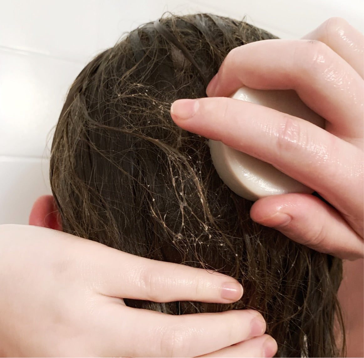After shampooing, rub conditioner bar directly onto wet hair, focusing on the ends. If you have longer hair, you can pull it over one shoulder and "paint" the ends of your hair with the conditioner bar.